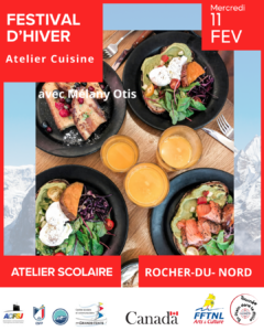 Dans le cadre du Festival d’Hiver 2026, les élèves sont invités à participer à un atelier cuisine animé par Mélany Otis. Cet atelier permettra aux participants de découvrir des techniques culinaires tout en s’amusant et en partageant un moment créatif.
