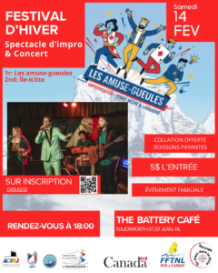 Dans le cadre du Festival d’Hiver 2026, venez profiter d’une soirée conviviale alliant improvisation théâtrale et musique. Une collation sera offerte, et des boissons payantes seront disponibles sur place.