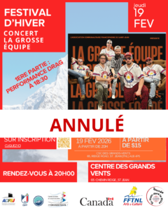 Nous regrettons de vous informer que le concert de La Grosse Équipe, prévu le 19 février 2026 dans le cadre du Festival d’Hiver 2026, est annulé.