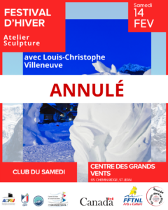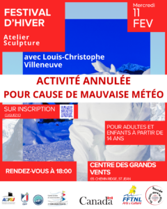 Dans le cadre du Festival d’Hiver 2026, un atelier de sculpture animé par Louis-Christophe Villeneuve était prévu le samedi 14 février 2026 au Centre des Grands Vents.