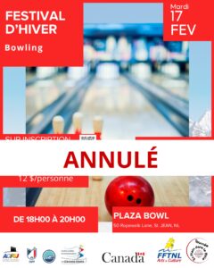 Nous vous informons que l’activité Bowling prévue le mardi 17 février de 18 h à 20 h au Plaza Bowl est malheureusement annulée.