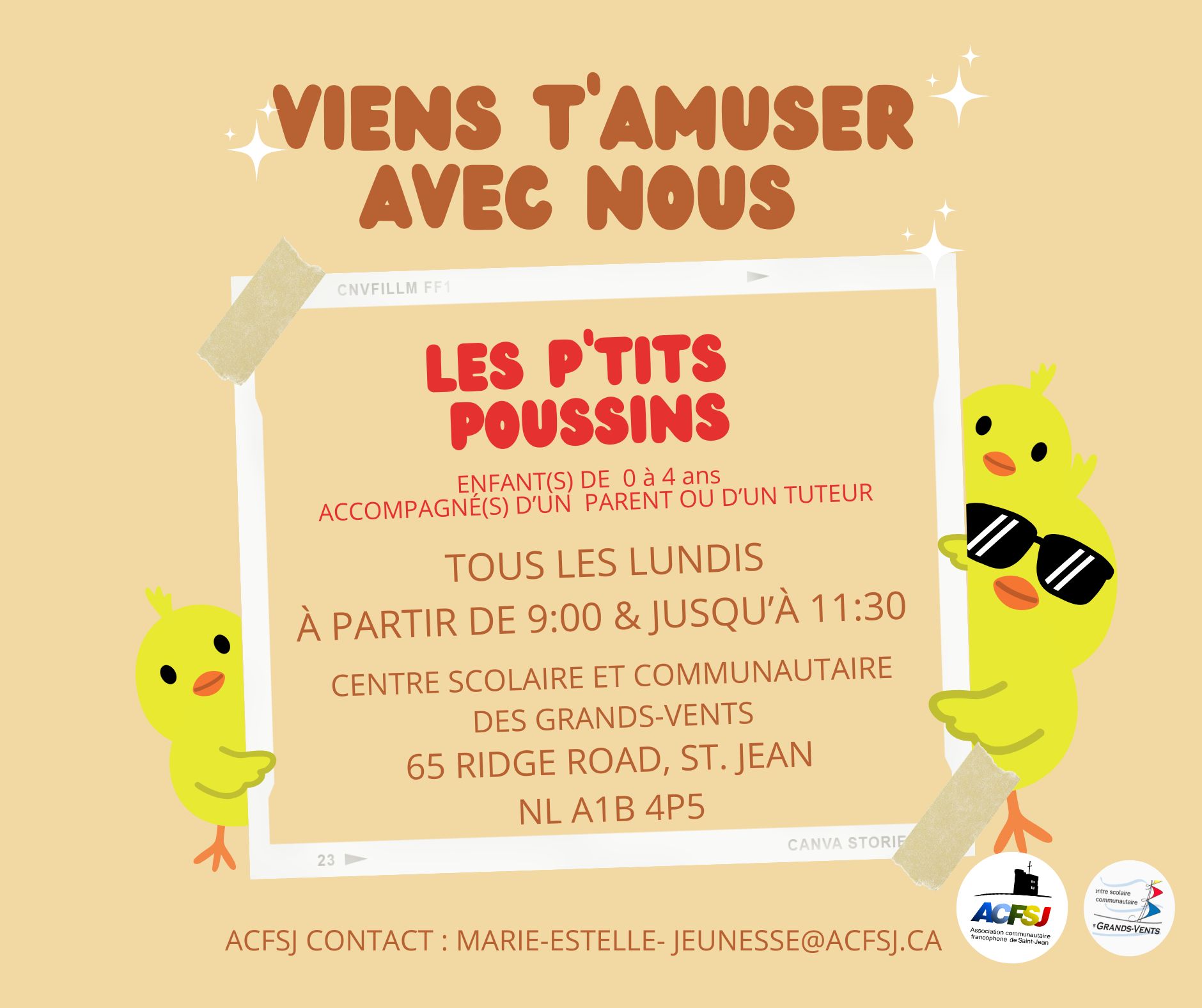 Le groupe de jeu Les P’tits Poussins revient ce lundi 17 novembre 2025 ! C’est une belle occasion pour les tout-petits de jouer, découvrir et rencontrer d’autres enfants, pendant que les parents profitent d’un moment convivial. Jour :Tous les lundis matins Heure : 9 h à 11 h 30 Lieu :CSC des Grands-Vents Salle de prématernelle 65 Ridge Rd, St. Jean(TNL)