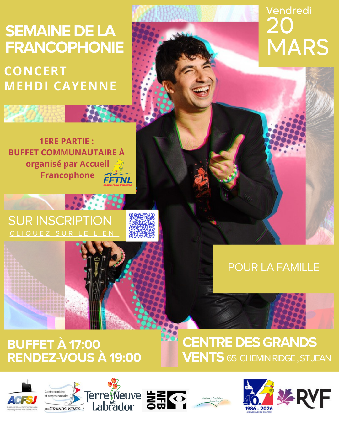 À 19 h, le public pourra assister au concert de Mehdi Cayenne, artiste reconnu pour son énergie sur scène et son style musical unique. Sa performance promet une soirée dynamique et festive qui saura rassembler les amateurs de musique francophone. Ce spectacle est présenté en collaboration avec le Réseau culturel francophone de Terre-Neuve-et-Labrador.